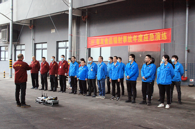 2022年10月26日,有友食品开展了2022年辐射事故应急演练。本次参与演练人员由应急小组人员、公司24小时值班领导、辐射安全管理人员、公司安全环保部人员,辐照装置运行人员、叉车人员构成。