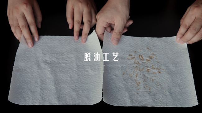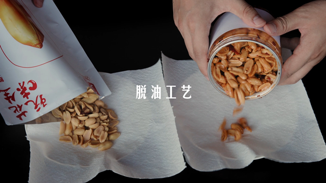 将有友脱油花生和其他品牌的花生分别倒于吸油纸上,轻轻按压,对比吸油纸上的油渍,差异非常明显。经过实验对比,可以清晰地看到,有友脱油花生更清爽、不油腻、不沾手。